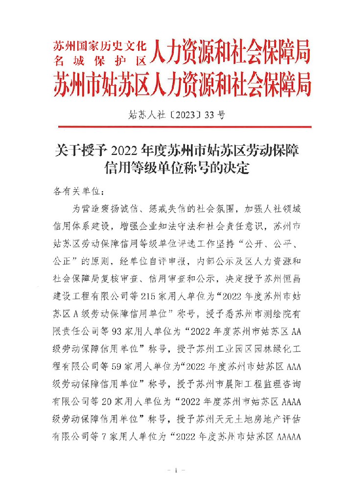 關于授予2022年度蘇州市姑蘇區勞動保障信用···